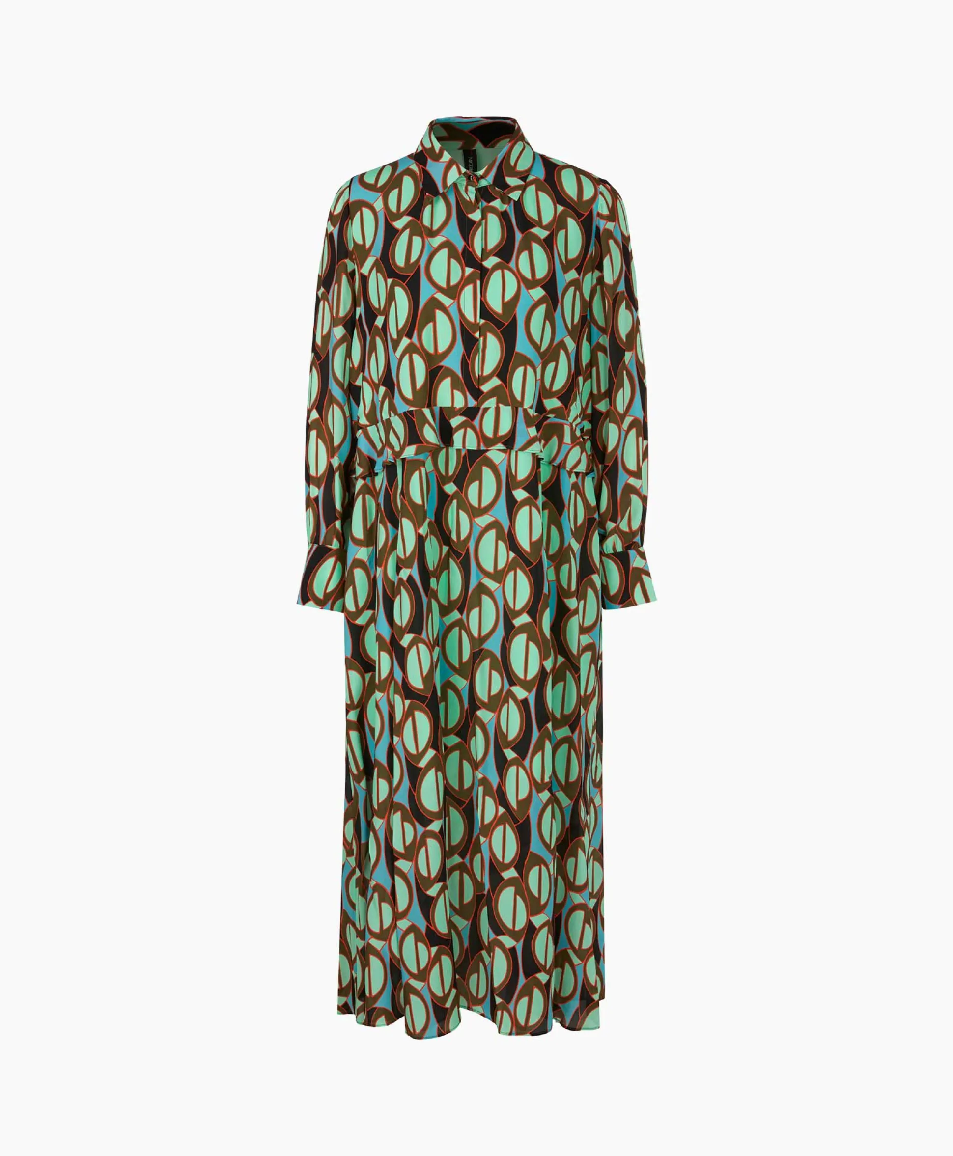 Een Nonchalant Wijde Snit Van Soepelvallende Viscose In Midilengte Kenmerkt Het Silhouet Van Deze Jurk. De Jurk Is All-Over Versierd Met Een Grafisch Patroon. De Taille Wordt Geaccentueerd Door Een Volant. Een Halve Knopenrij, Een Overhemdkraag En Mouwen Met Manchetten Ronden Het Ontwerp Af. Het Model Is 179 Cm Lang En Draagt Maat N3 / 38. Materiaal: 100% Polyester, 100% Viscose.