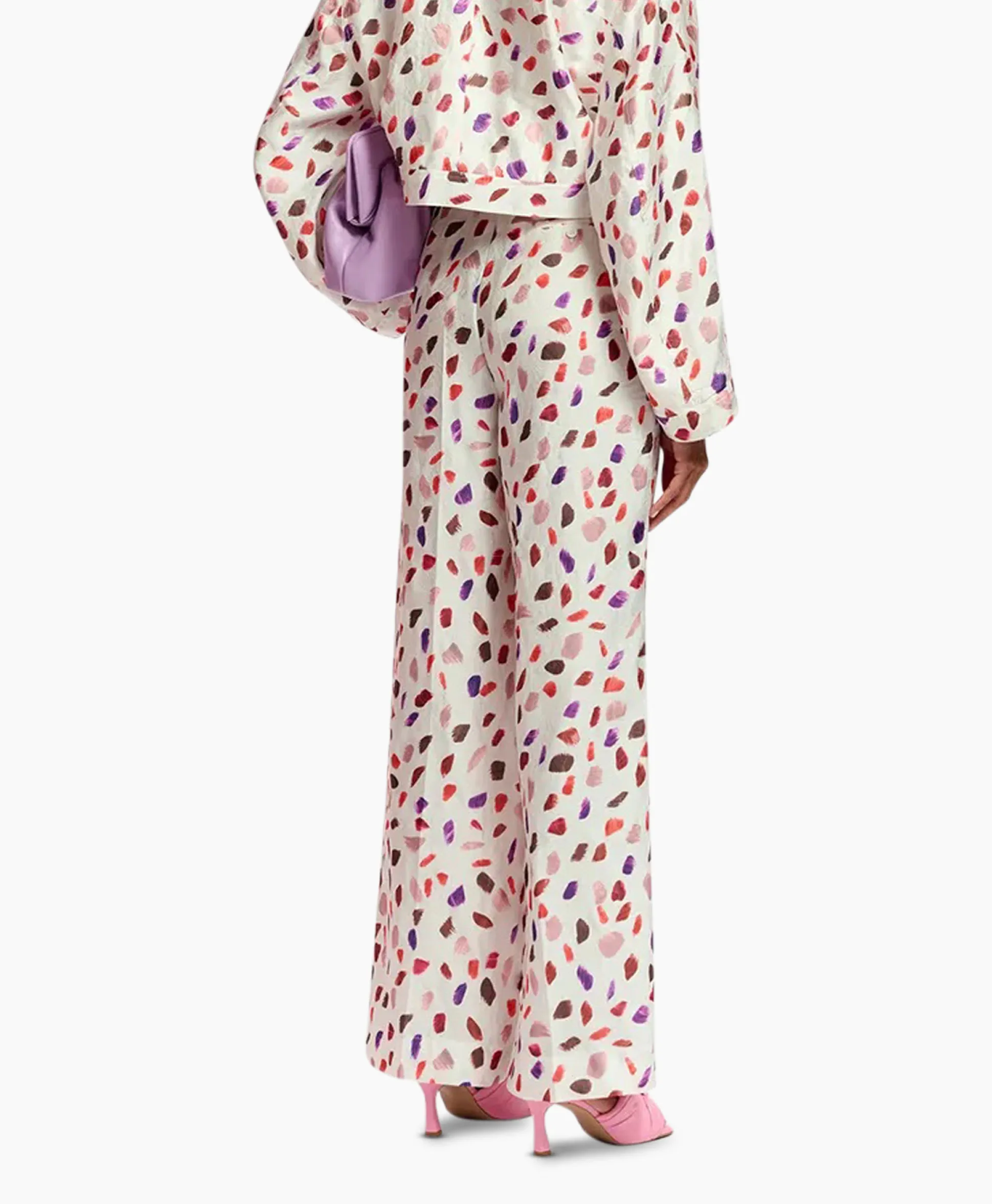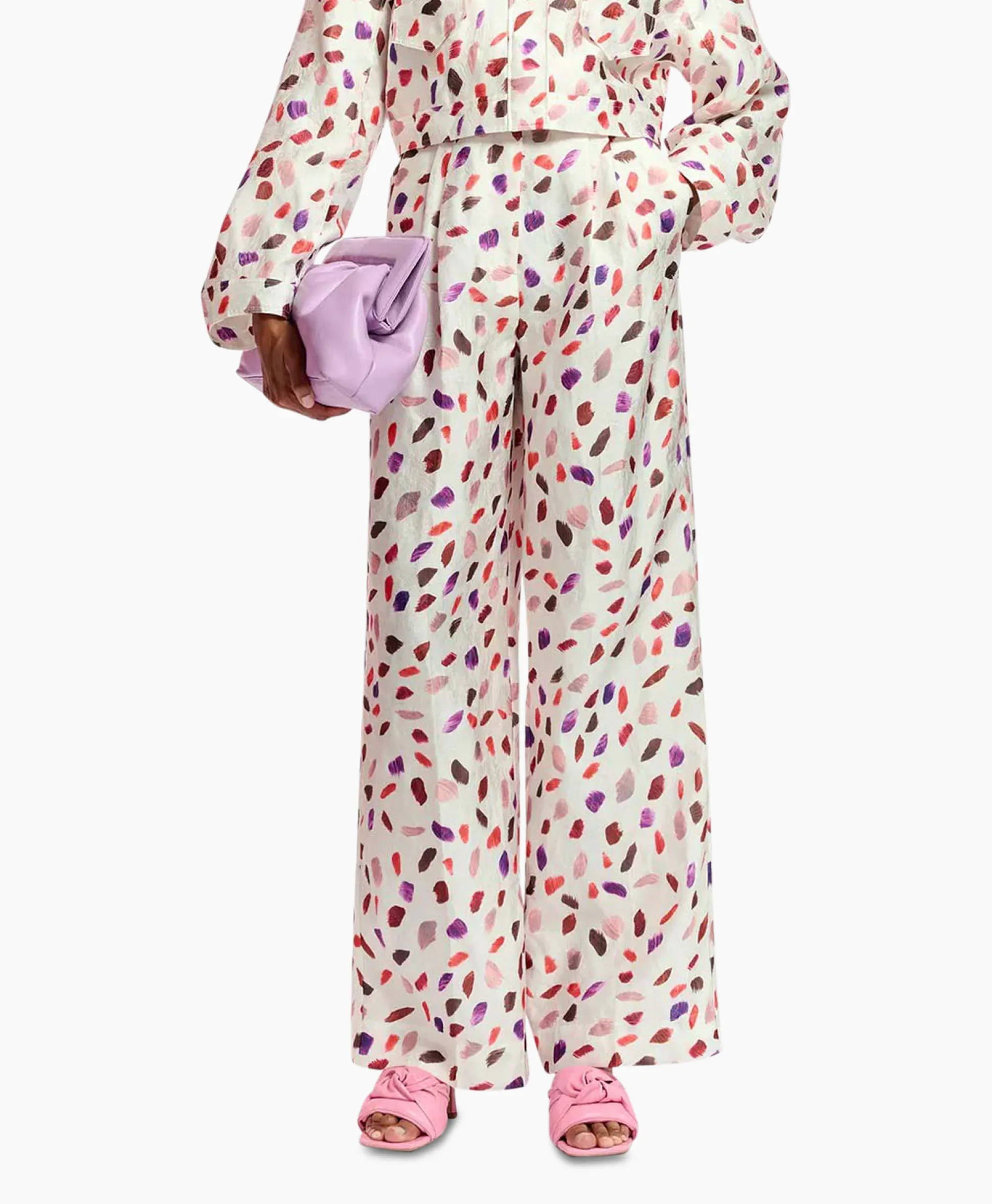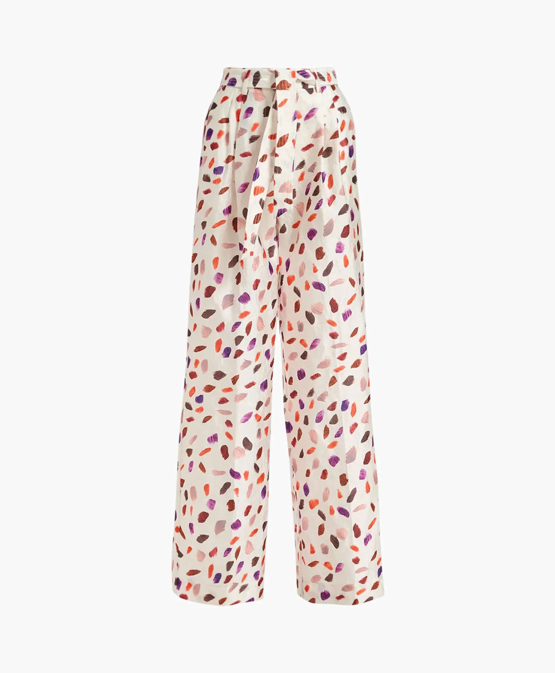 Broek Met Brede Pijpen, Geweven Van Een Glanzend Bloemenjacquard Dat Prachtig Het Licht Opvangt, Afgewerkt Met Een Stoffen Riem Om De Hoge Taille Te Accentueren. De Pasvorm Is Afgewerkt Met Een Vouw Vooraan En Achteraan, En Functionele Steekzakken In De Zijnaden. Het Model Is 180 Cm Groot En Draagt Een Maat 36.&Nbsp;