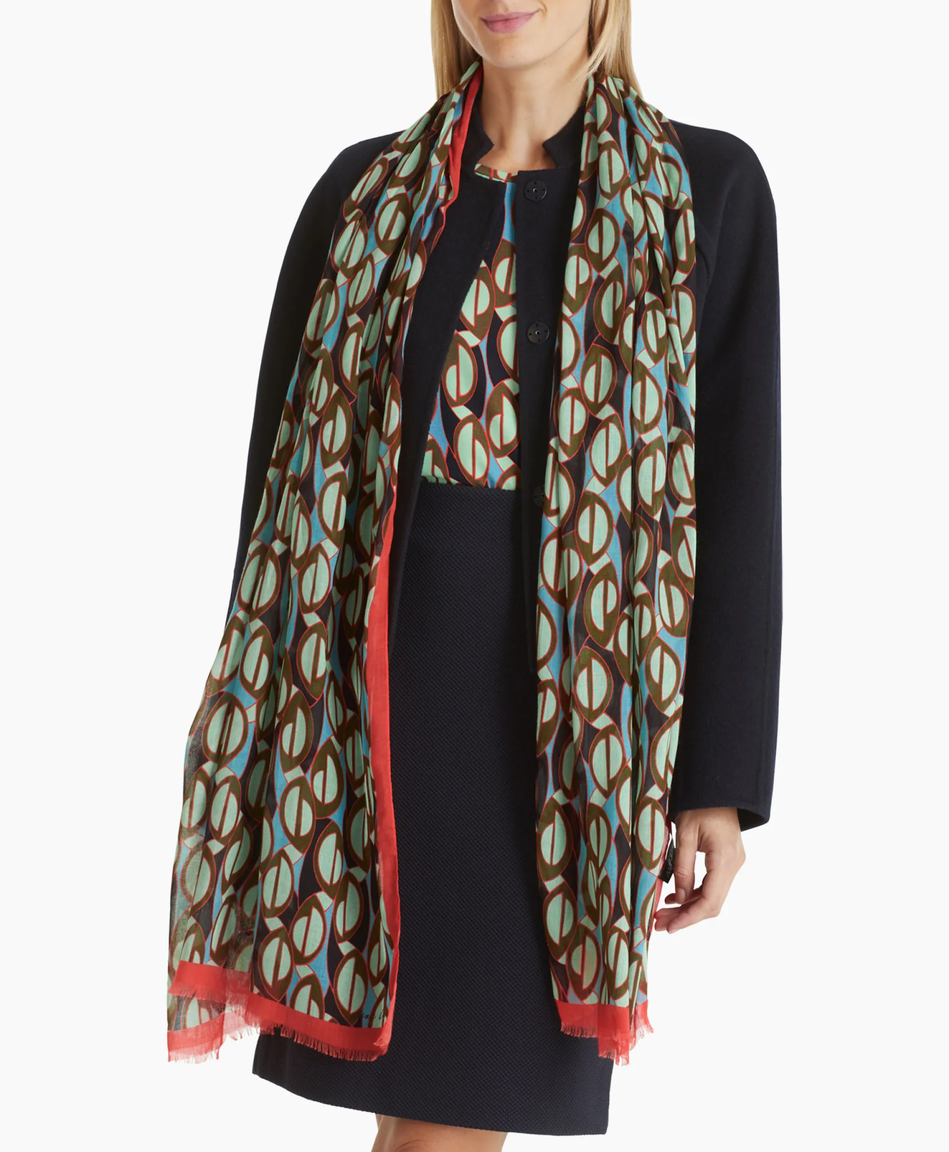 De Shawl Is Gemaakt Van Een Ragfijne Materialenmix Van Modal Met Zijde. De Markante Grafische Print Is Bij De Randen Monochroom Omlijst. De Randen In Lengterichting Zijn Doorgestikt, De Uiteinden Gerafeld. Afmeting: 70X200Cm.