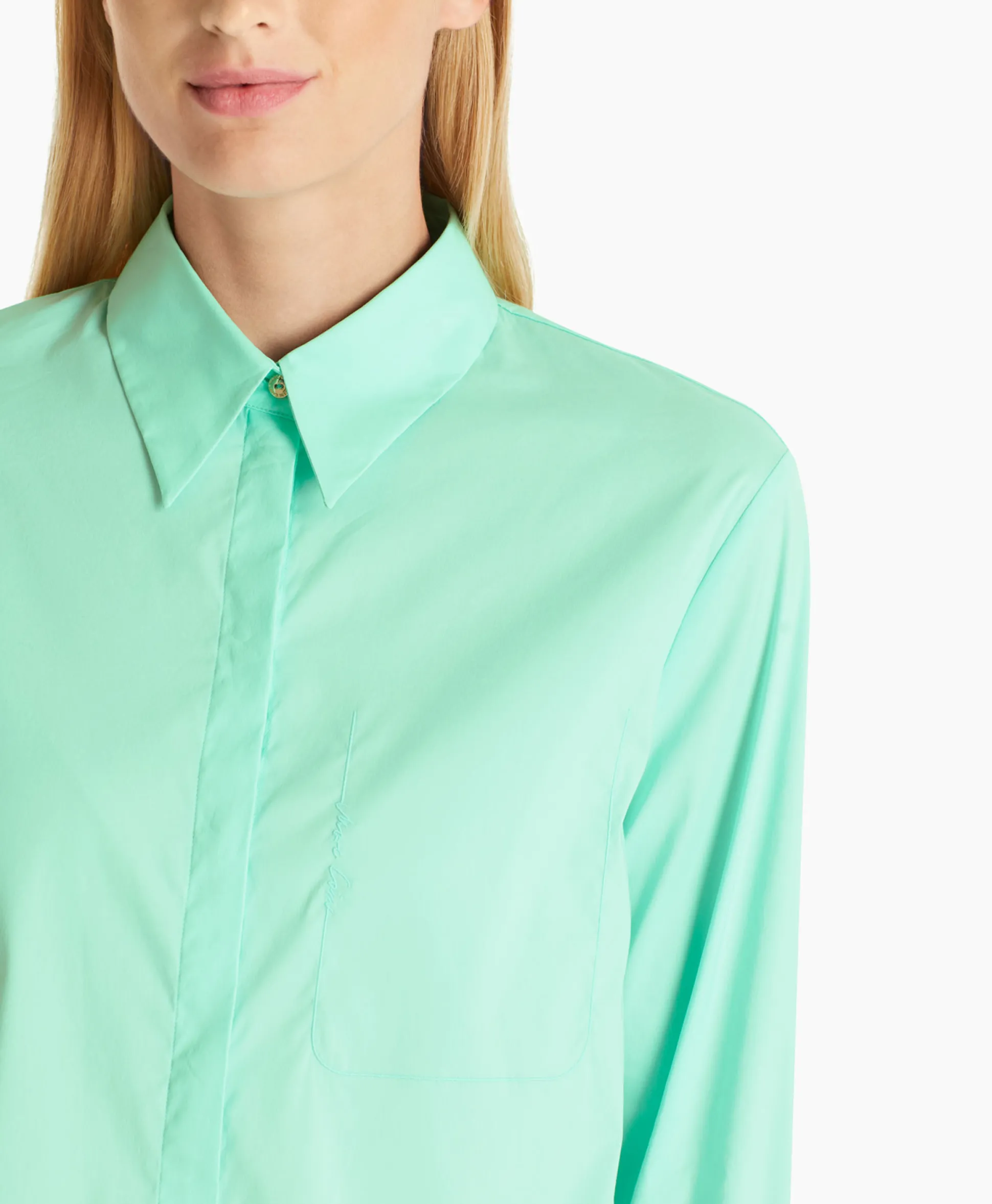 Blouse In Een Materialenmix Met Katoen En Elastaan. Dankzij De Kraag En De Mouwen Met Manchetten Krijgt Deze Blouse Een Klassieke Look. De Knopenrij Is Elegant Bedekt, De Verlengde Rug Heeft Splitten Aan De Zijkant. Een Klein Extraatje Is Het Smalle, Verticale Marc Cain Opschrift Op De Linkerborst. Het Model Is 179 Cm Lang En Draagt Maat 3.&Nbsp;