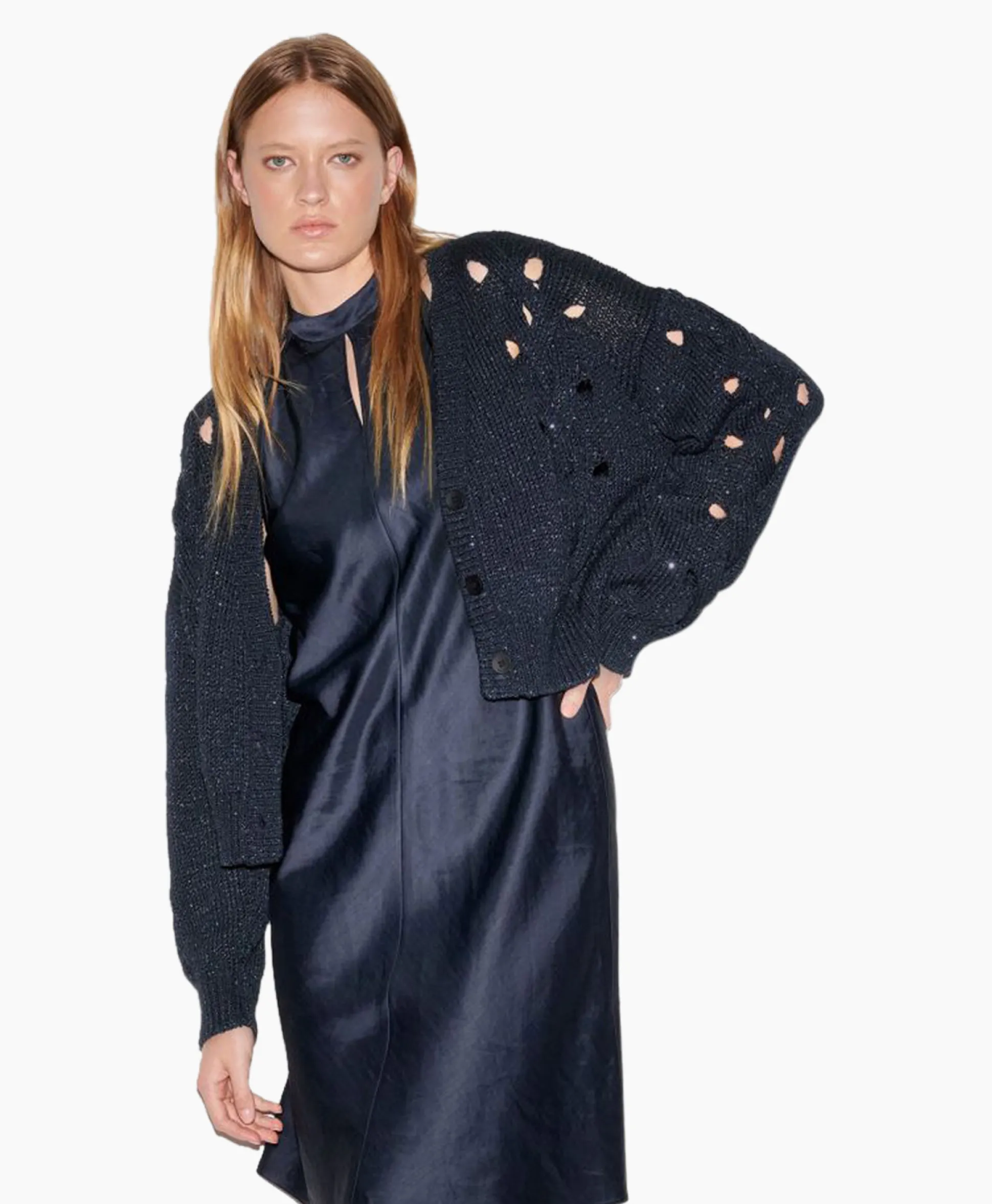 Vest Van Zomers, Gebreid Bandgaren Met Een Cropped Model En Een Ingewikkeld Kabelpatroon Met Opengewerkte Structuur. Het Vest Heeft Geribde Zomen, Glinsterende Pailletten En Een Drieknoopssluiting. Ons Model Is 178 Cm Lang En Draagt Maat 36.&Nbsp;