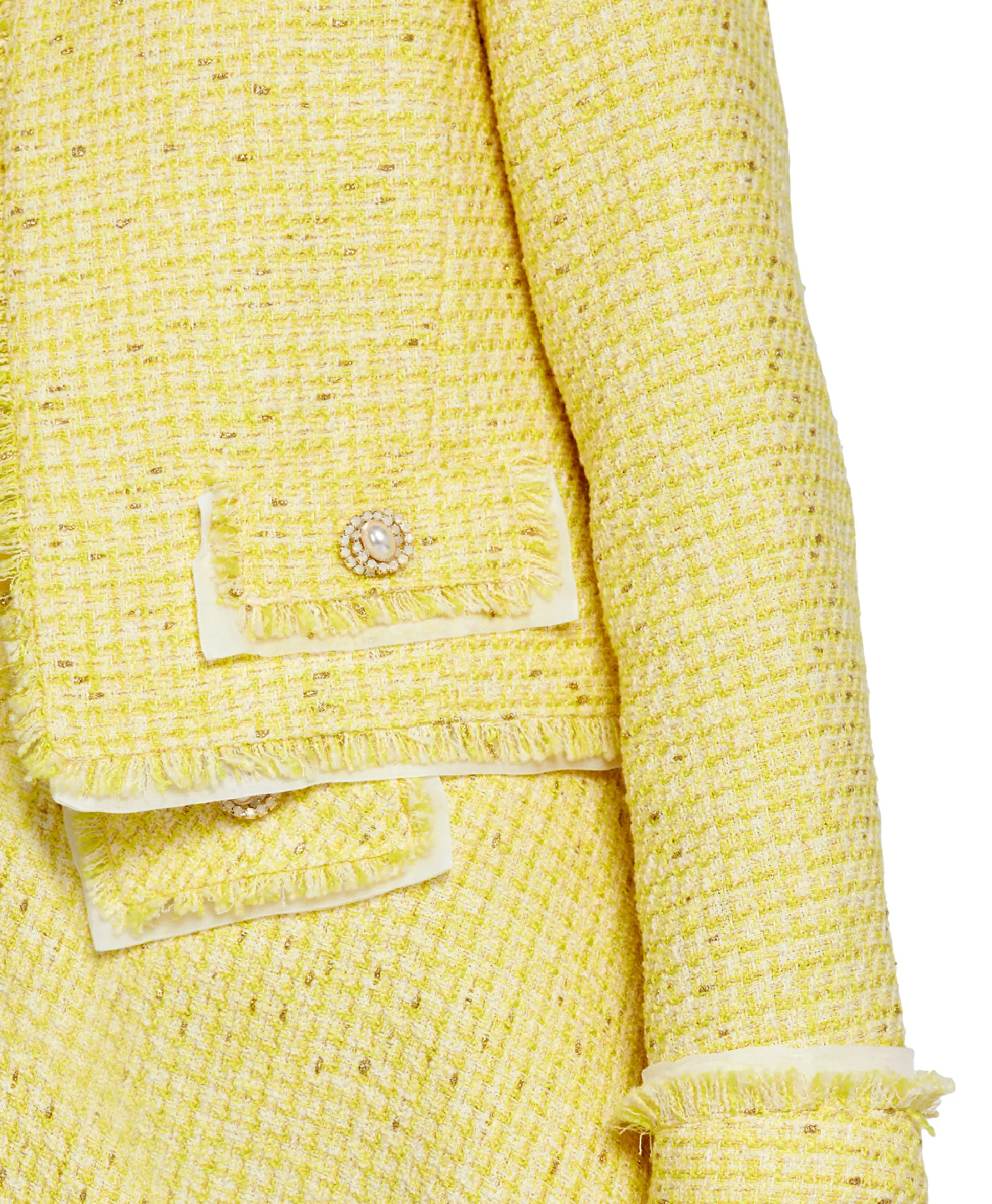 Dit Jasje Is Geïnspireerd Door De Stijl Van De Sixties. Het Is Gemaakt Van Een Bouclé-Achtig Materiaal. Het Jasje Is Afgewerkt Met Coole Franjes Aan De Kraag, Randen, Mouwen En Kleppen. Verder Heeft Het Jasje Sierknopen Van Glitterstenen En Parels Die Passen Bij Het Glittergaren In De Stof. Het Model Is 179Cm Lang En Draagt Een N3/38. We Adviseren Je Om Een Maat Groter Te Bestellen.